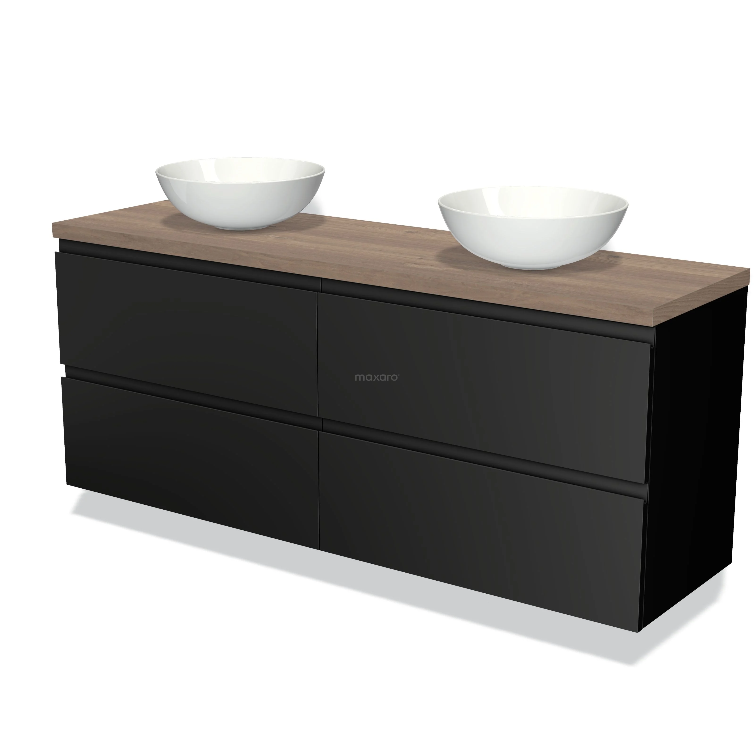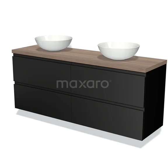 Modulo Plato Badmöbel mit Aufsatzwaschbecken | 160 cm Matt Schwarz Grifflos front Mittelbraune Eiche blatt 4 Schubladen