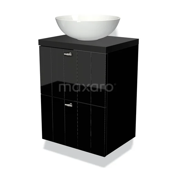 Modulo Plato Slim Badmöbel mit Aufsatzwaschbecken | 50 cm Hochglanz Schwarz Lamelle front Matt Schwarz blatt 2 übereinanderliegende Schubladen