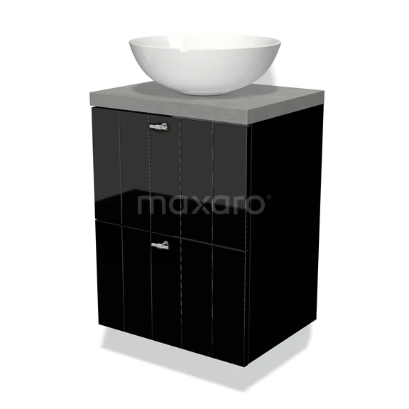 Modulo Plato Slim Badmöbel mit Aufsatzwaschbecken | 50 cm Hochglanz Schwarz Lamelle front Hellgrauer Beton blatt 2 übereinanderliegende Schubladen