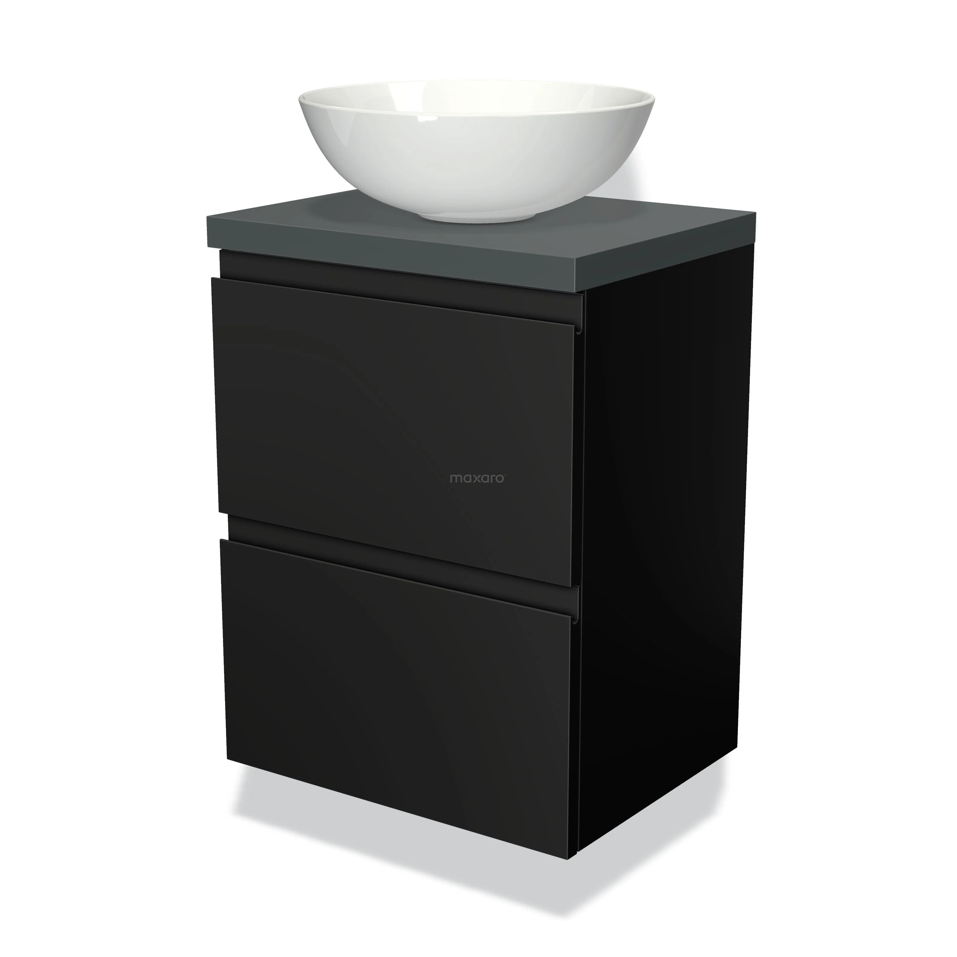 Modulo Plato Slim Badmöbel mit Aufsatzwaschbecken | 50 cm Matt Schwarz Grifflos front Dunkelgrau blatt 2 übereinanderliegende Schubladen