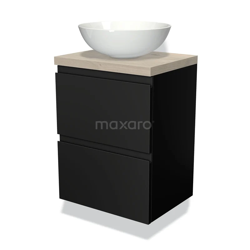 Modulo Plato Slim Badmöbel mit Aufsatzwaschbecken | 50 cm Matt Schwarz Grifflos front Hellgraue Eiche blatt 2 übereinanderliegende Schubladen