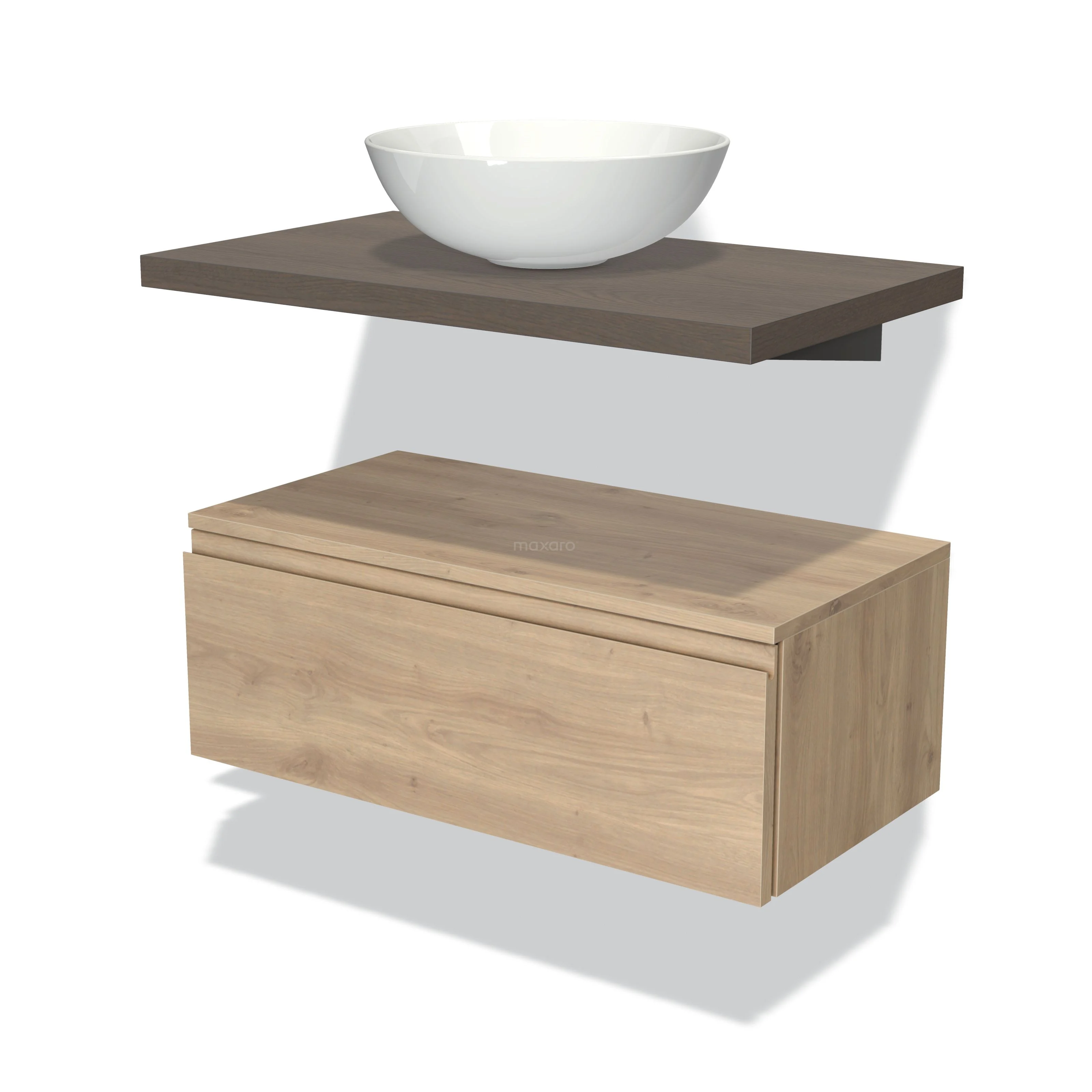 Waschtischunterschrank mit Konsole 80 cm Modulo Plato Hellbraune Eiche 1 Schublade Grifflos Dunkelbraune Eiche Platte
