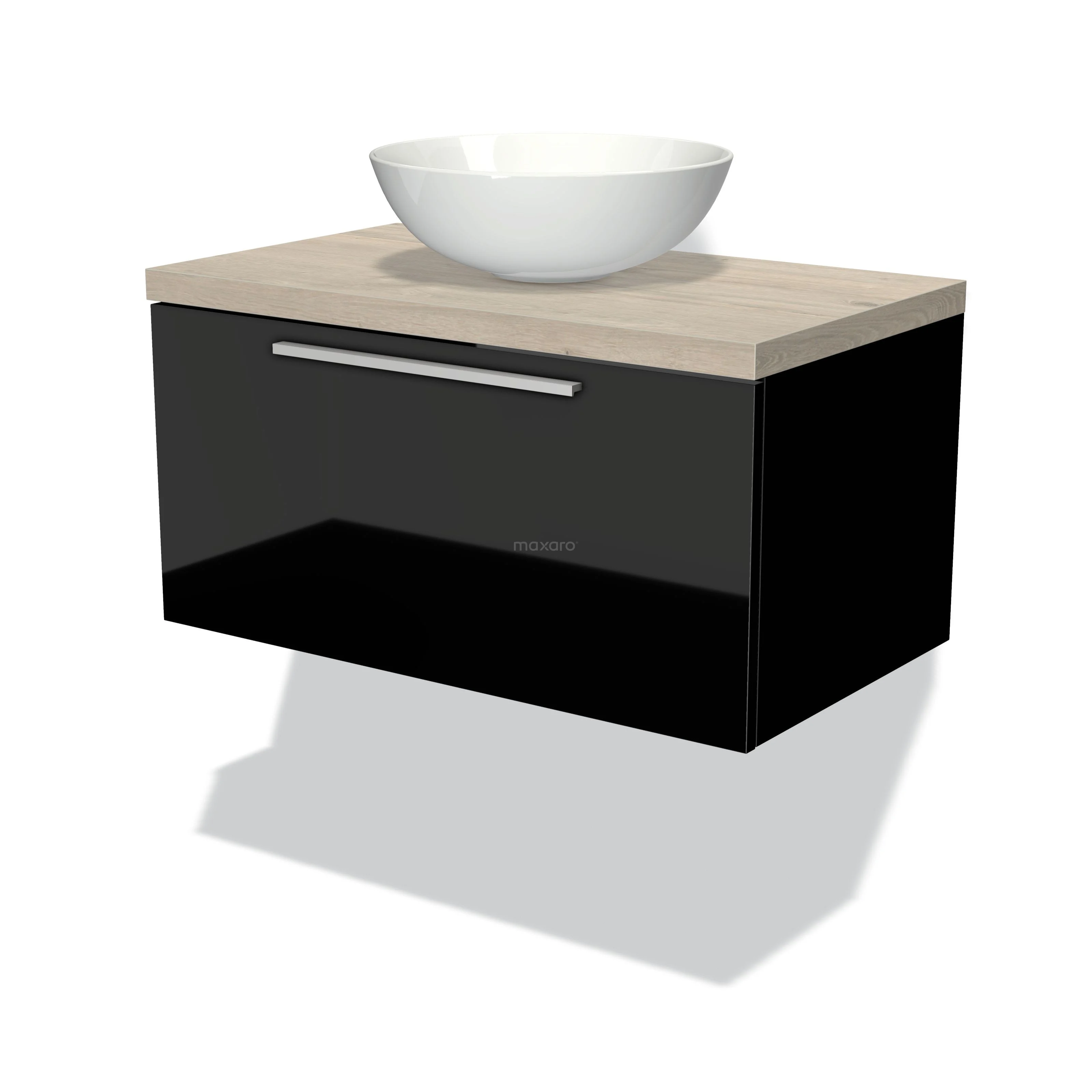 Waschtischunterschrank mit Konsole 80cm Modulo Plato Hochglanz Schwarz 1 Schublade Flach Hellgraue Eiche Platte