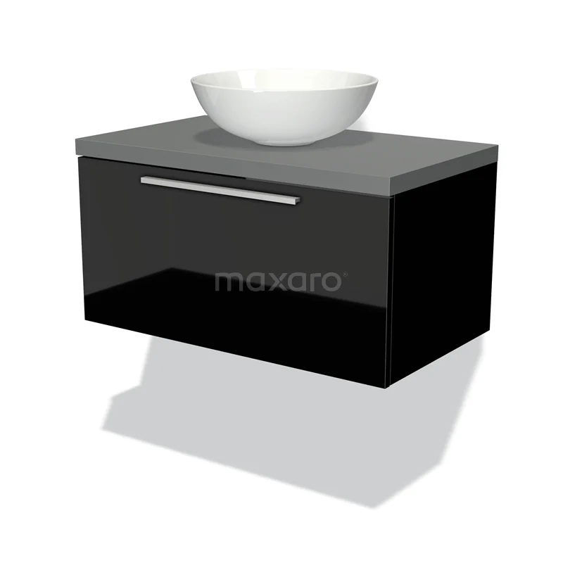 Waschtischunterschrank mit Konsole 80cm Modulo Plato Hochglanz Schwarz 1 Schublade Flach Mittelgrau Platte