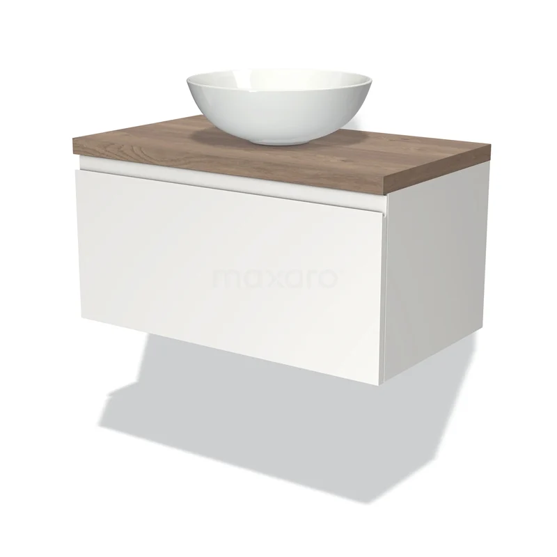 Waschtischunterschrank mit Konsole 80cm Modulo Plato Matt Weiß 1 Schublade Grifflos mittelbraune Eiche Platte