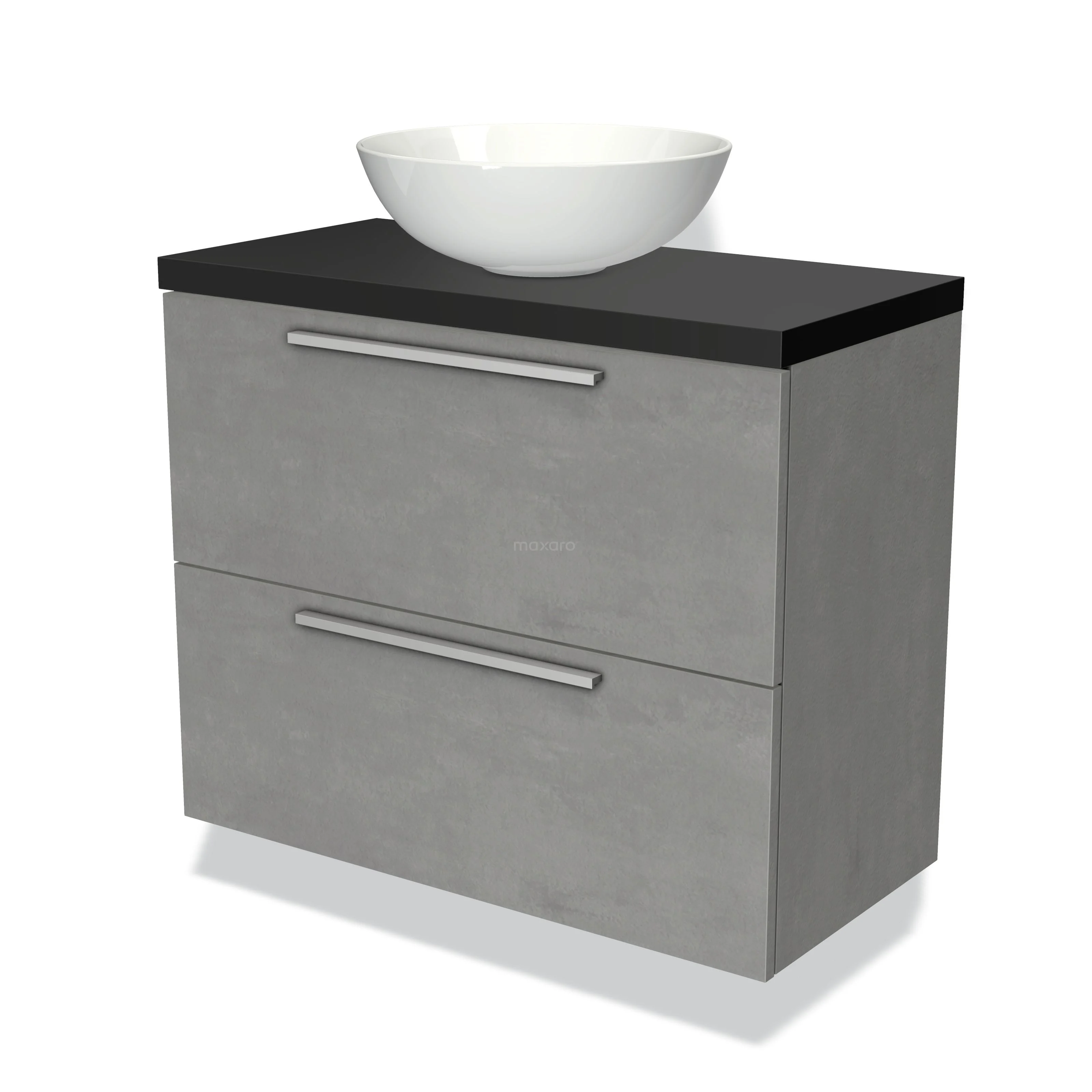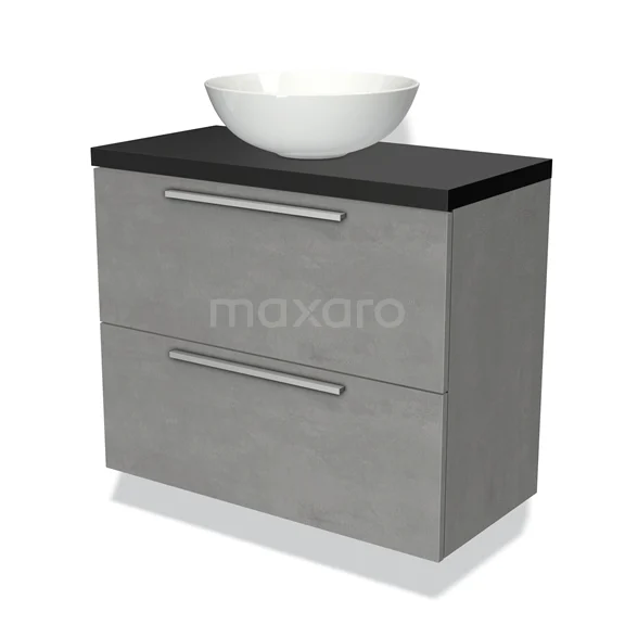 Modulo Plato Slim Badmöbel mit Aufsatzwaschbecken | 80 cm Hellgrauer Beton Flach front Matt Schwarz blatt 2 übereinanderliegende Schubladen
