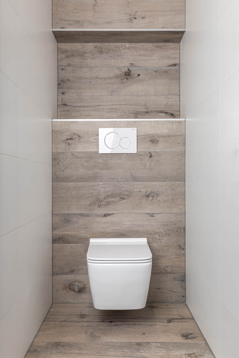 Mit Holzoptikfliesen verleihst du dem WC-Raum eine warme, natürliche Ausstrahlung. Der naturgetreue Charakter dieser Fliesen macht, dass sie kaum von echtem Holz zu unterscheiden sind. Kombiniere die Holzoptik mit stilvollen Fliesen in Natursteinoptik in Beige- oder Brauntönen für einen schönen Kontrast. Möchtest du die natürliche Atmosphäre bis ins Detail durchziehen? Dann ist ein Handwaschbecken aus Naturstein ideal. Damit verleihst du dem WC-Raum einen luxuriösen Touch. Das weiße WC und das Bedienfeld durchbrechen die warmen Farbtöne und geben dem Ganzen eine frische Note.