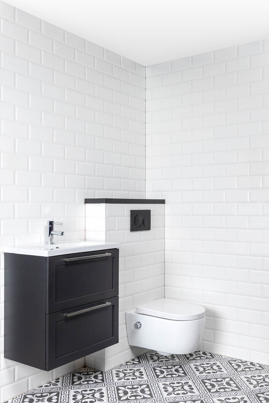 Dekorfliesen verleihen dem WC-Raum eine stilvolle und klassische Atmosphäre. Dabei sorgt das auffällige Muster der Fliesen für einen schönen Kontrast auf dem Boden. Um den Raum zum Leben zu erwecken, sind weiße Metrofliesen ideal. Diese sind mit einem einzigartigen 3D-Effekt versehen, wodurch das Ganze eine besondere Note erhält. Mit einem schwarzen Waschtisch machst du das Interieur komplett.
