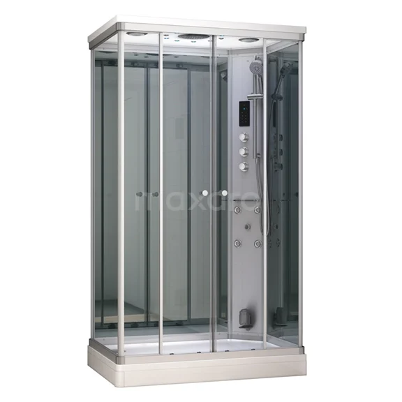 Die Dampfkabine hat eine großzügige Größe von 140x90 cm und bietet 2 Benutzerplätze, sodass Sie zusammen mit Ihrem Partner optimal genießen können. Die Schiebetür macht das Ein- und Aussteigen sehr einfach und ist zudem platzsparend. Dieses Modell mit quadratischen Formen verfügt über 6 mm klares Sicherheitsglas und wunderschönes Spiegelglas. Zusammen mit dem silbernen Pulverbeschichtungsrahmen sorgt dies für ein modernes Erscheinungsbild. Die Duschwanne und das Dach aus Mineralguss passen hier perfekt dazu.