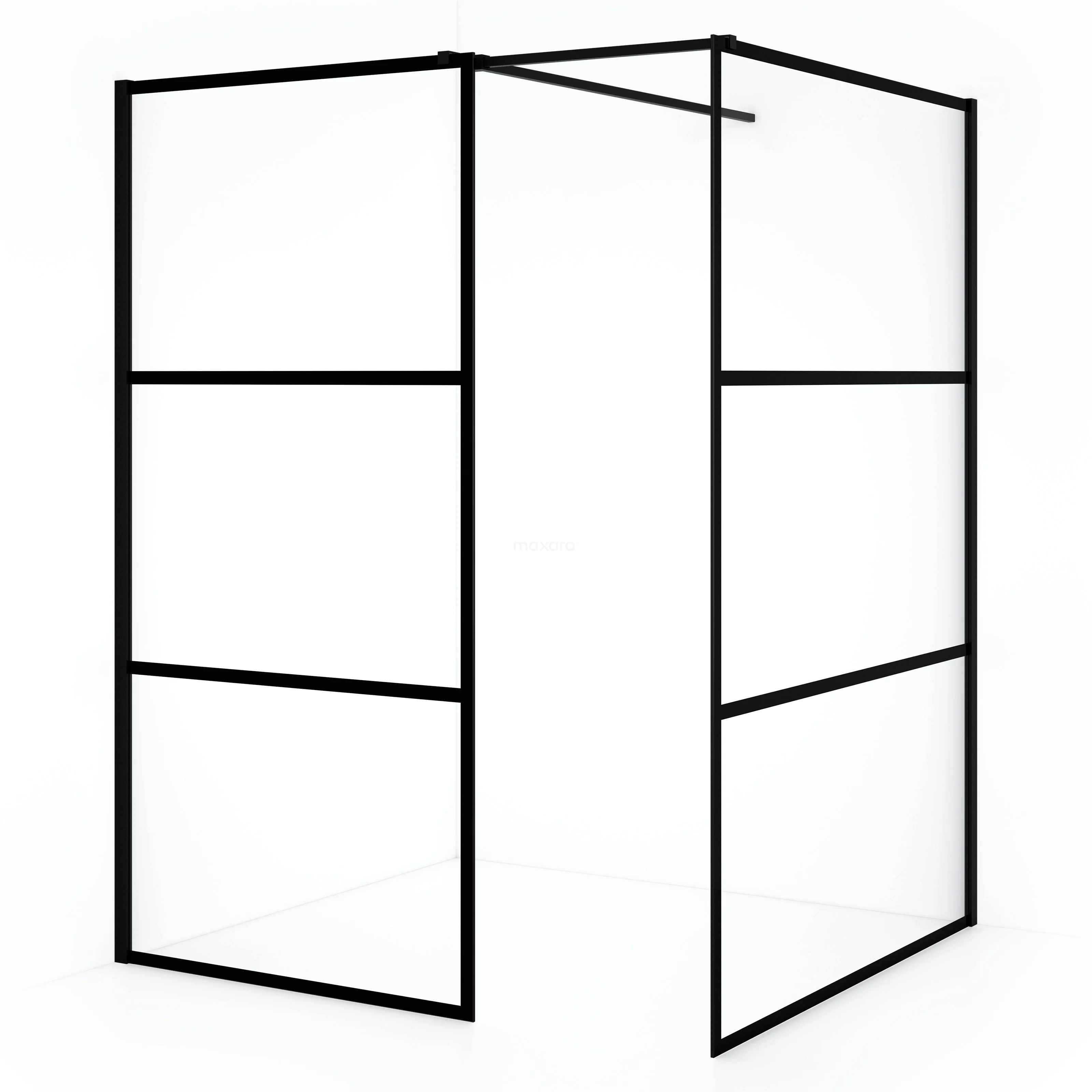 In der stilvollen begehbaren Dusche Diamond können Sie jeden Tag herrliche Duschsitzungen genießen. Sie hat eine robuste, mattschwarze Oberfläche und verfügt über Klarglas mit schwarzen Streifen für einen industriellen Touch. Die begehbare Dusche ist verstellbar und lässt sich daher leicht anpassen. Die feste Wand lässt sich von 136,8 bis 138,3 cm verstellen. Die andere feste Wand lässt sich von 86,8 bis 88,3 cm verstellen. Dies ist die minimale und maximale Breite.