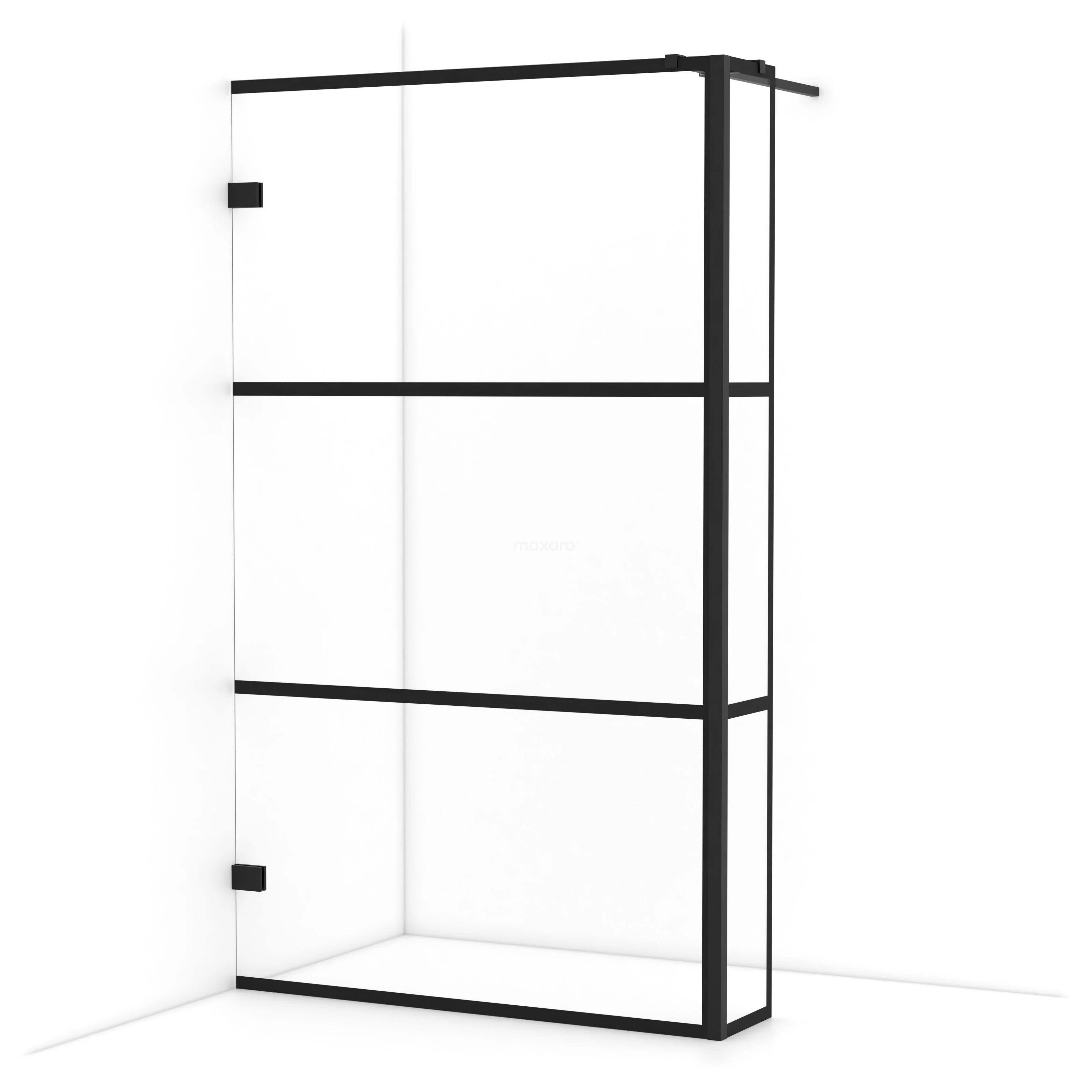Schwarze, industrielle Duschwand mit Klarglas und Metallprofilen, perfekt für einen modernen Badezimmerstil.