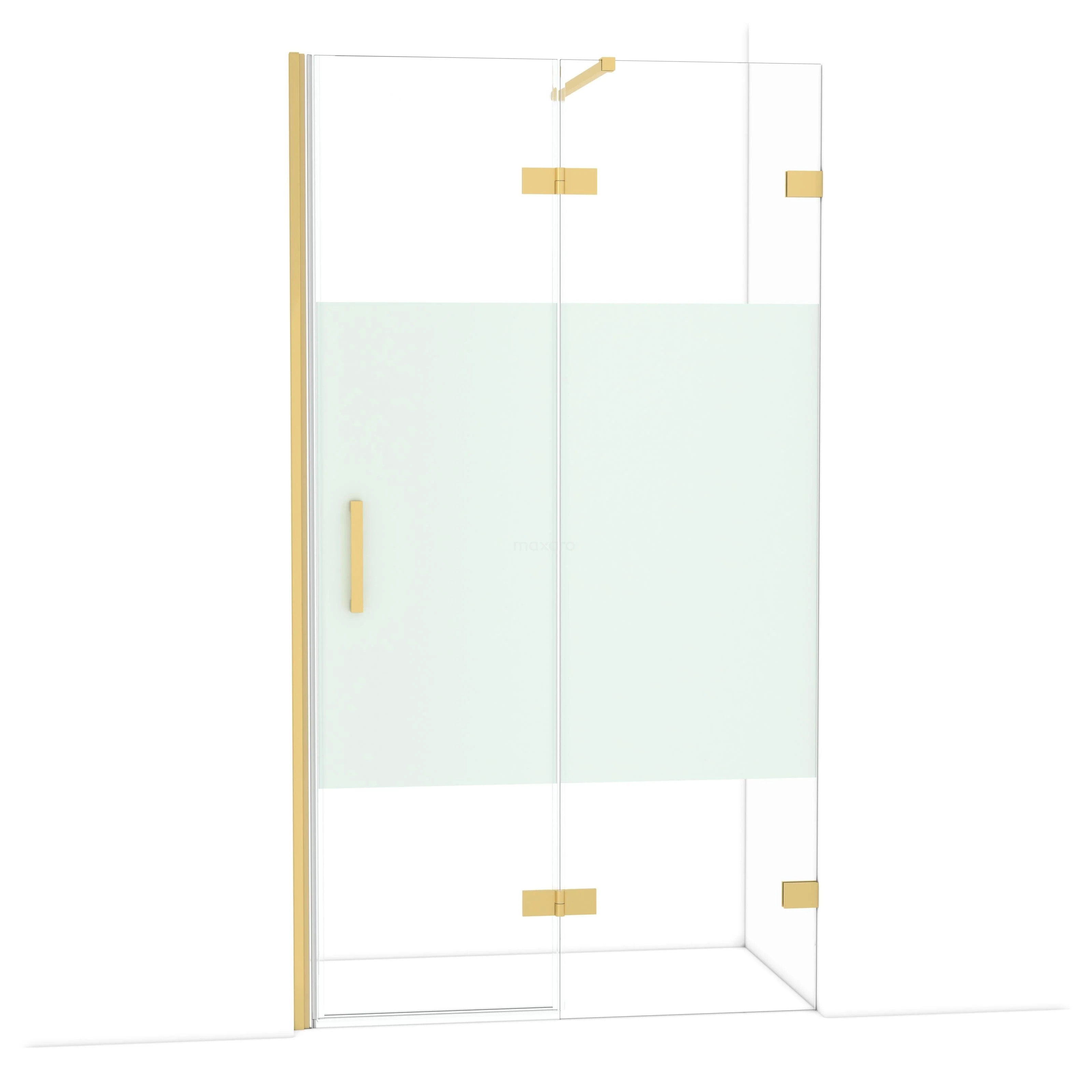 Die Diamond-Drehtür von 110 cm ist ideal, um deine Duschnis abzuschließen. Dieses Exemplar hat ein luxuriöses Design aus Gold und ist mit hochwertigen Scharnieren, einer Zweipunktbefestigung und einem vertikalen Griff ausgestattet. Das Klarglas mit matter Streifen sorgt für mehr Privatsphäre. Durch die Verstellbarkeit lässt sich die Duschtür leicht anpassen. Die Gesamtbreite ist von 111,7 bis einschließlich 112,7 cm verstellbar.