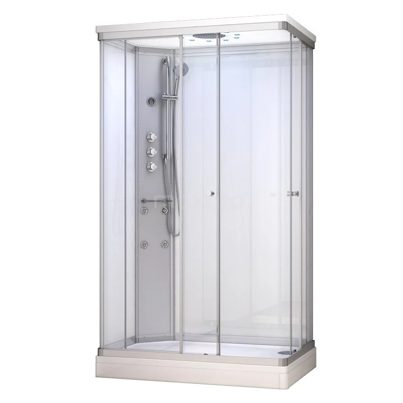 Design Dieses 120x80 cm große rechteckige Modell bietet viel Bewegungsfreiheit. Ideal, wenn Sie gerne Platz haben oder gemeinsam duschen. Sie steigen einfach über die Ecke ein und schließen die Schiebetüren mit einer sanften Bewegung. Da die Türen ausklickbare Räder haben, können Sie die Schienen leicht reinigen. Die Kabine hat 6 mm klares und weißes Sicherheitsglas. Zusammen mit dem silberfarbenen, pulverbeschichteten Rahmen entsteht ein modernes Aussehen. Die Duschwanne und das Dach sind aus Mineralguss gefertigt.
