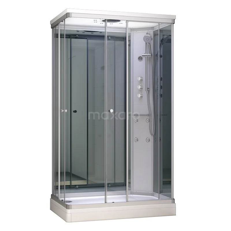 Design Dieses elegante, rechteckige Modell von 120x80 cm bietet viel Bewegungsfreiheit. Sie steigen einfach über die Ecke ein und schließen die Schiebetüren mit einer sanften Bewegung. Da die Türen mit doppelten ausklickbaren Rollen ausgestattet sind, können Sie die Schienen leicht reinigen. Neben 6 mm starkem, klarem Sicherheitsglas ist die Kabine mit verspiegeltem Glas ausgestattet. Dies verleiht der Dusche einen eleganten Touch und passt gut zu dem silberfarbenen, pulverbeschichteten Rahmen. Die Duschwanne und das Dach sind aus hochwertigem Mineralguss gefertigt.