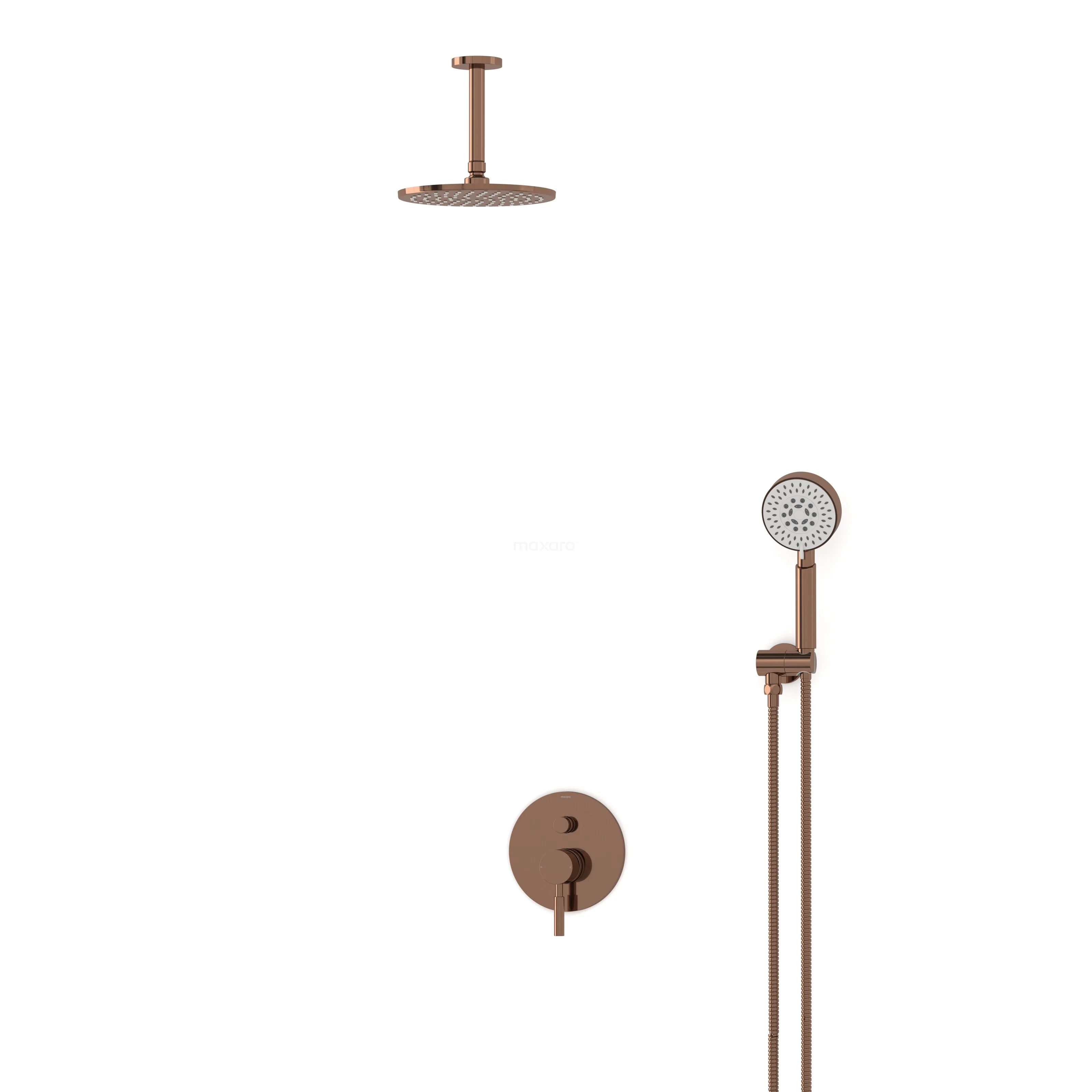 Das Duschset hat durch die glänzende kupferne Farbe eine luxuriöse Ausstrahlung und ist ideal, um als Akzent in Ihrem Badezimmer eingesetzt zu werden. Nur die Bedienelemente sowie die Hand- und Regendusche sind bei der Einbauvariante sichtbar. Dadurch erleben Sie einen räumlichen Effekt. Darüber hinaus schafft die runde Formgebung eine elegante Optik und Haptik. Mit diesem Set holen Sie sich einen echten Blickfang ins Haus.