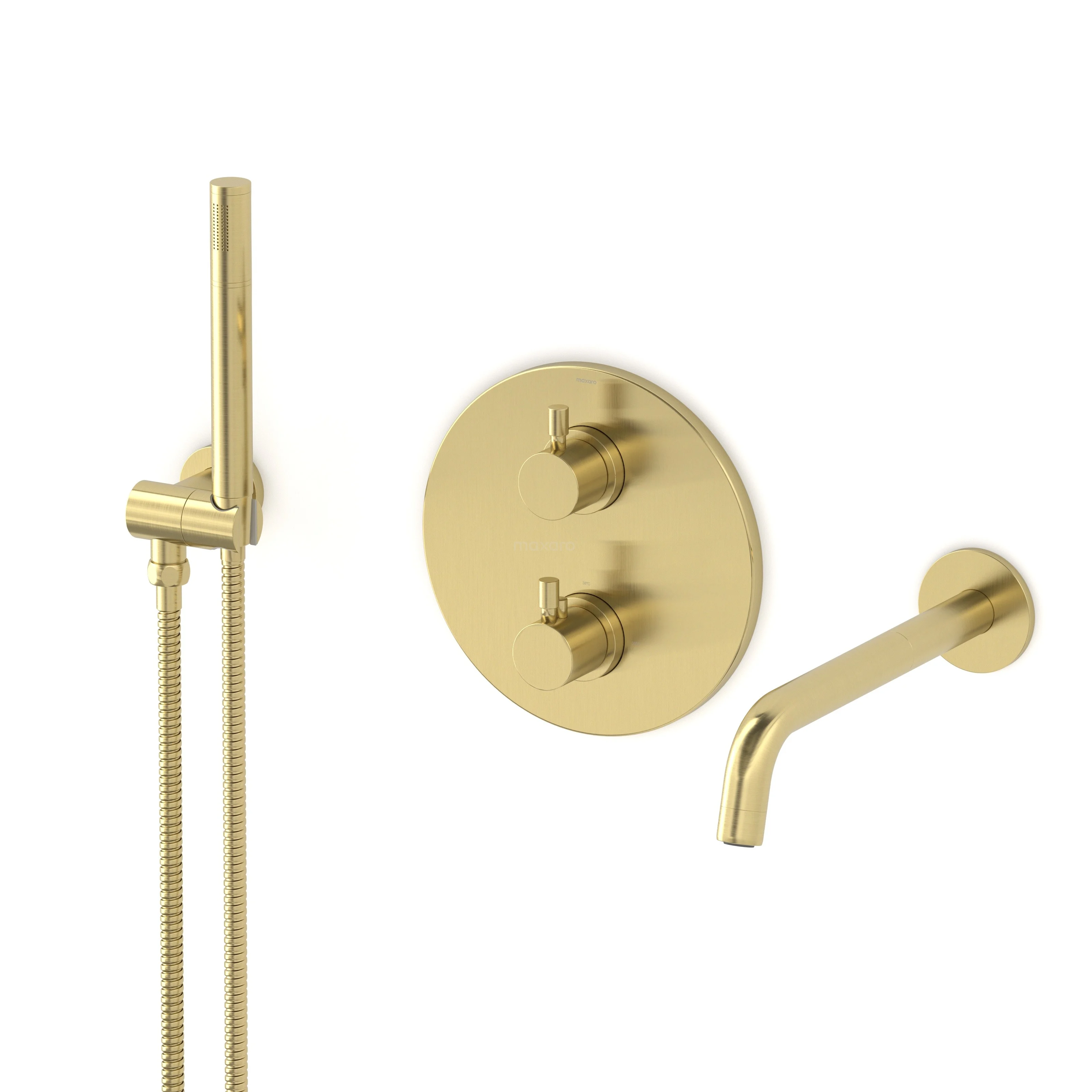 Diese verdeckte Badewannenarmatur mit Handbrause aus der Serie Serie hat ein rundes Design mit einer luxuriösen, hellgoldenen Oberfläche und ist eine stilvolle Ergänzung für Ihr Badezimmer. Das Set enthält eine Thermostatarmatur, einen Wanneneinlauf, eine gerade Handbrause, einen Handbrausehalter und einen Brauseschlauch. So haben Sie sofort alles, was Sie für Ihr Bad brauchen.