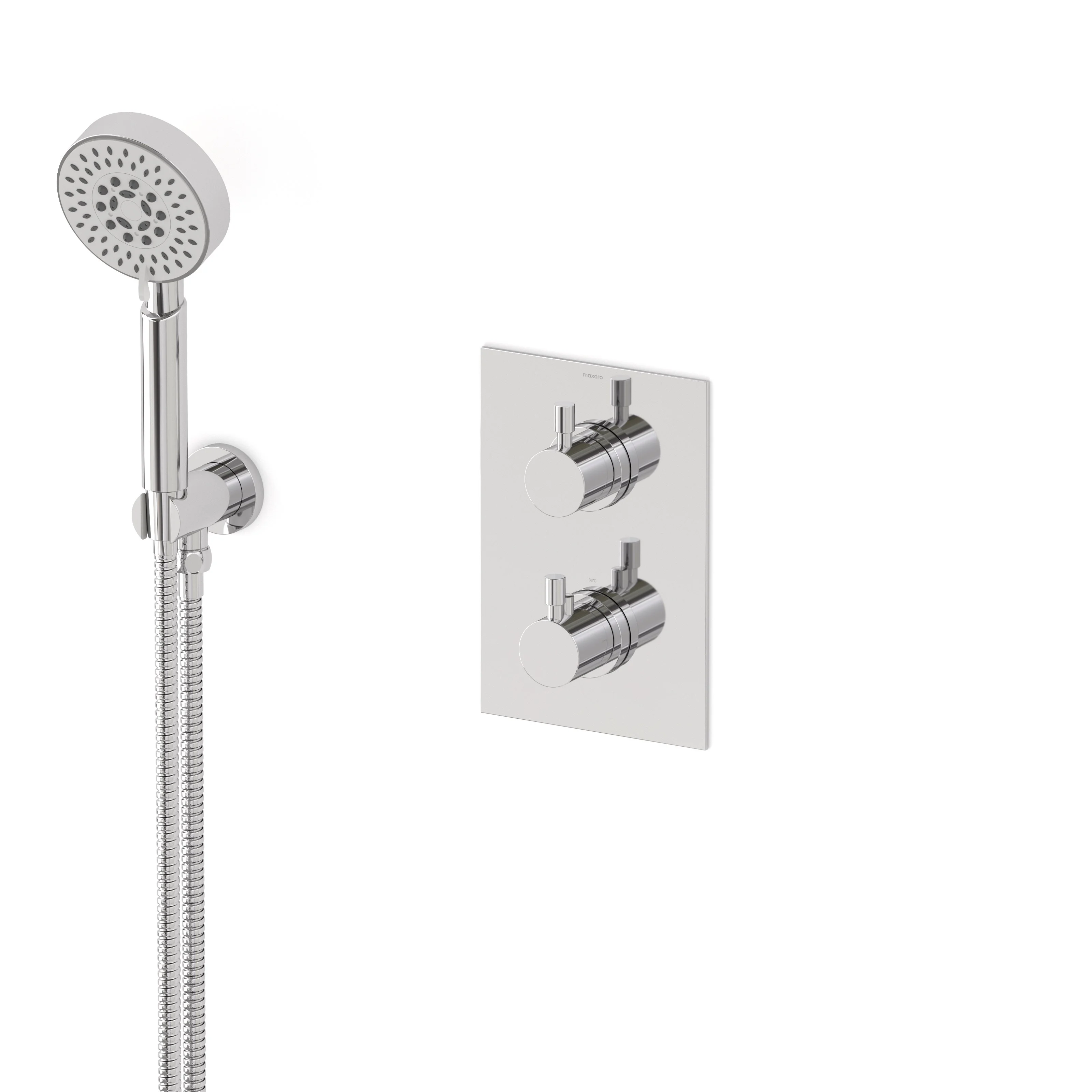 Dieses Unterputz-Duschset der Serie Radius ist eine schöne Ergänzung für Ihr Badezimmer. Das Set enthält eine Thermostatarmatur, eine runde Handbrause, einen Brauseschlauch und einen nicht verstellbaren Handbrausenhalter. So haben Sie sofort alles, was Sie für Ihre Dusche brauchen.