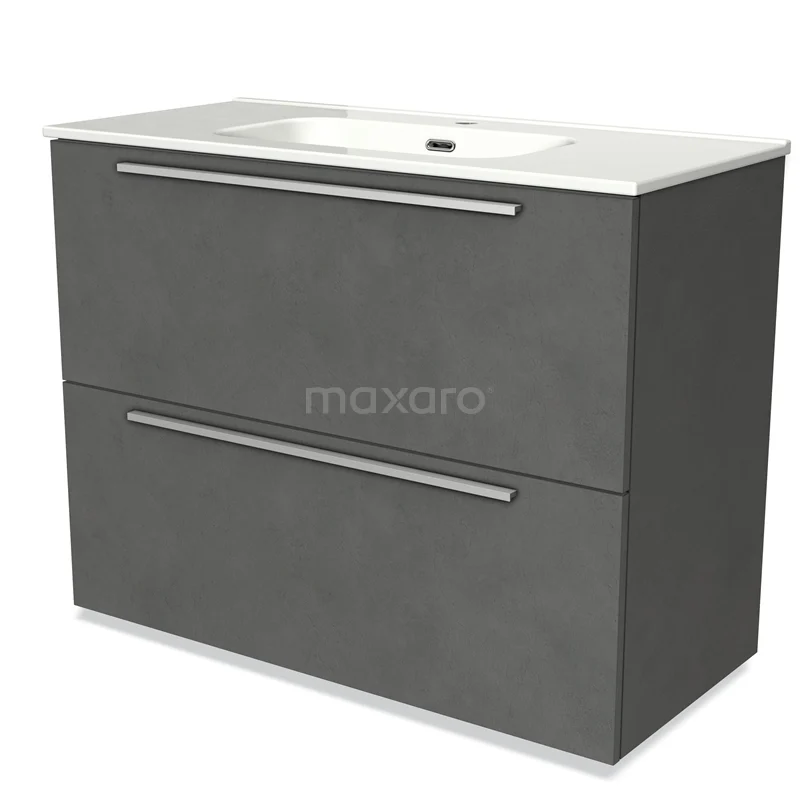 Badmöbel 100cm Modulo Dunkelgrauer Beton 2 hohe Schubladen Flaches Waschbecken aus Keramik