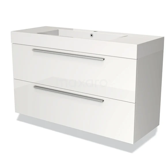 Badmöbel 120cm Modulo Hochglanz Weiß 2 Schubladen Flaches Waschbecken Mineralguss