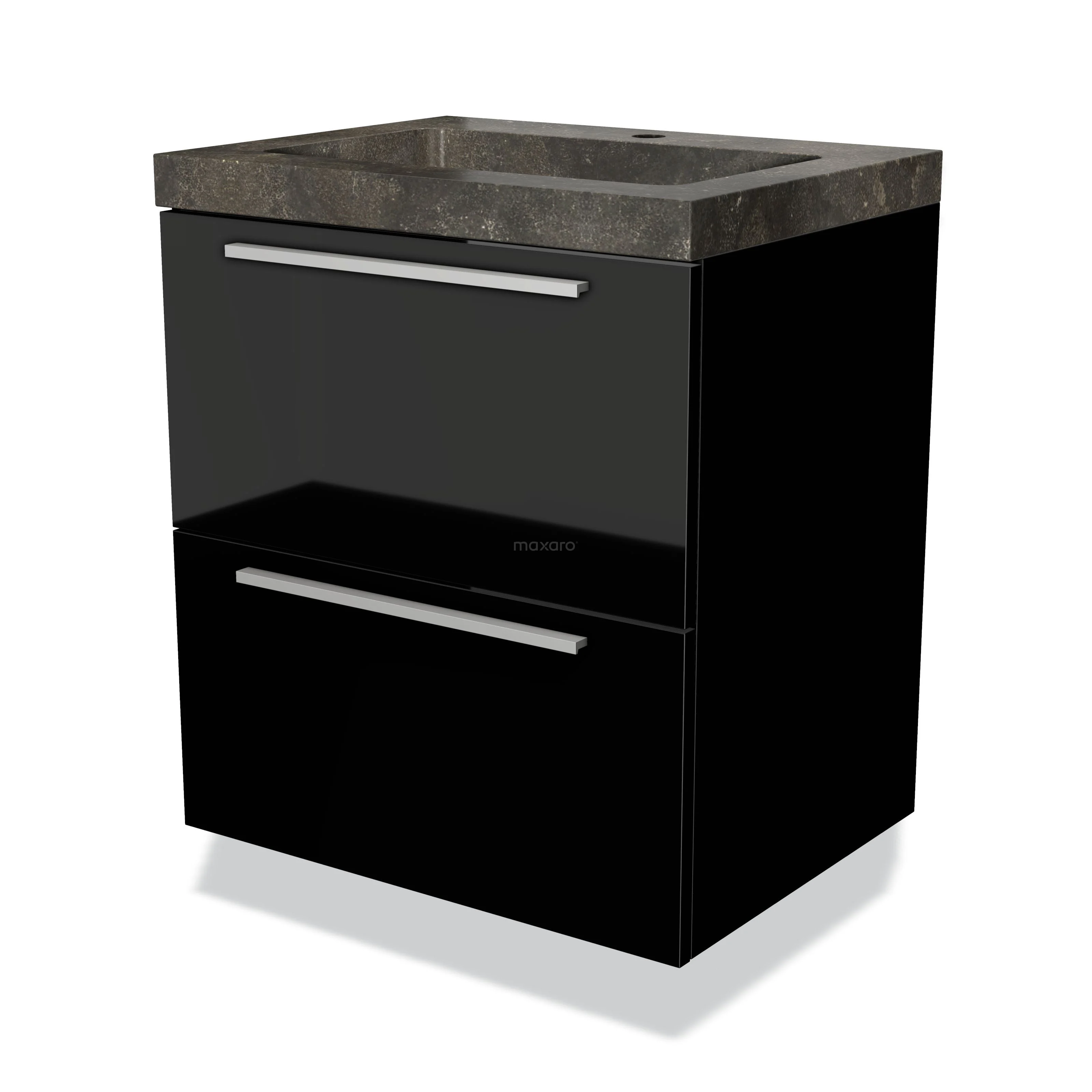 Badmöbel 60cm Modulo Hochglanz Schwarz 2 Schubladen Flaches Waschbecken Naturstein Blaustein
