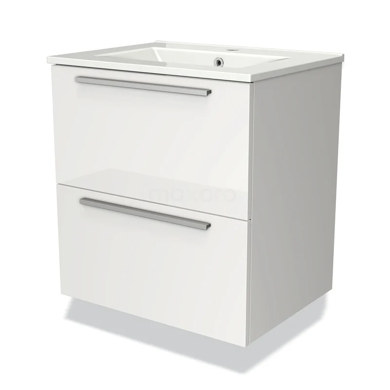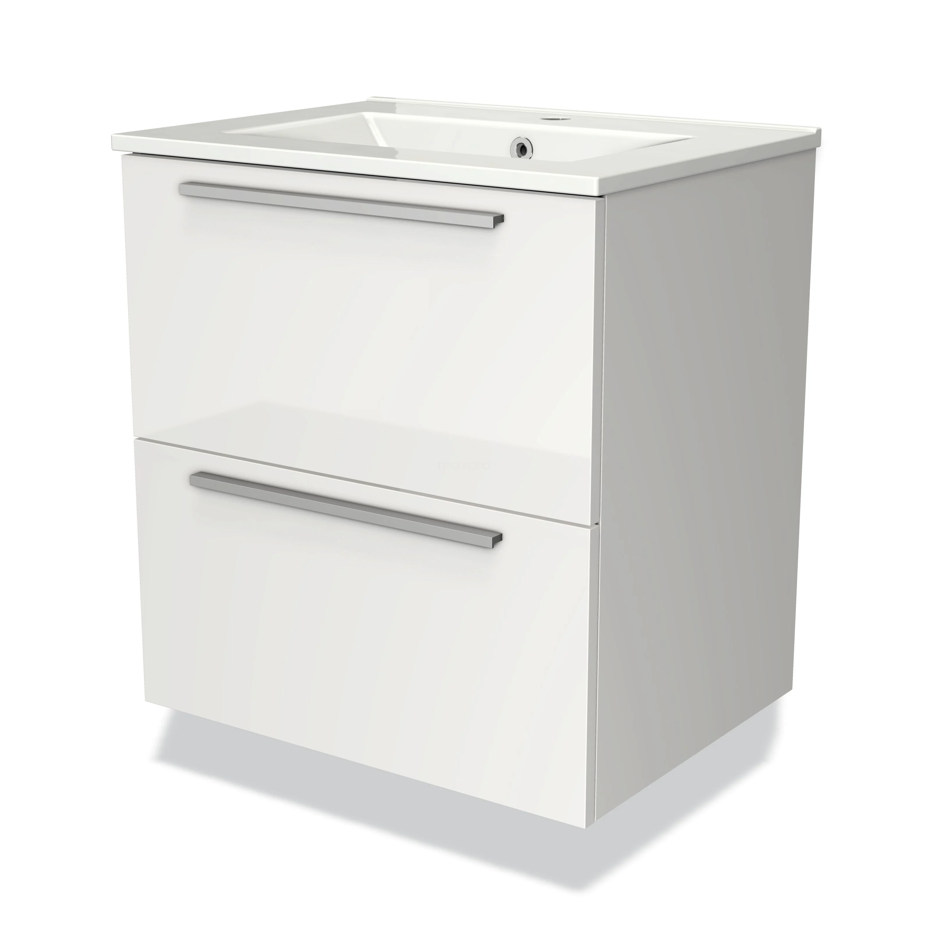 Badmöbel 60cm Modulo Hochglanz Weiß 2 Schubladen Flaches Waschbecken aus Keramik