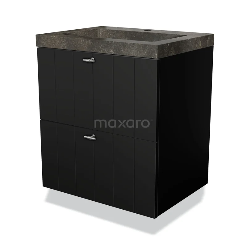 Badmöbel 60cm Modulo Matt Schwarz 2 Schubladen Lattenrost Waschbecken Naturstein Blau