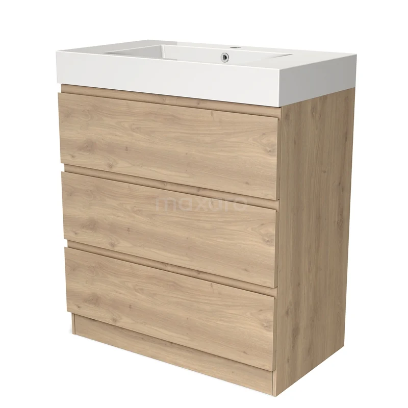 Badmöbel 80cm Modulo Hellbraune Eiche 3 Schubladen Griffloses Waschbecken Mineralguss