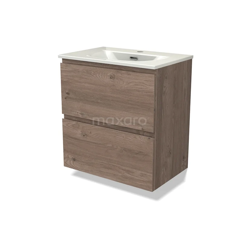 Modulo Slim Waschtische | 60 cm Mittelbraune Eiche Grifflos front Keramik 2 übereinanderliegende Schubladen