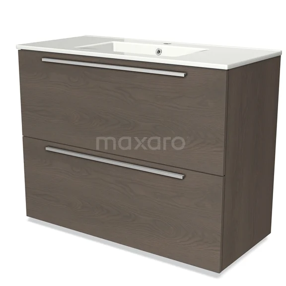 Modulo Waschtische | 100 cm Dunkelbraune Eiche Flach front Keramik 2 hohe Schubladen übereinanderliegend