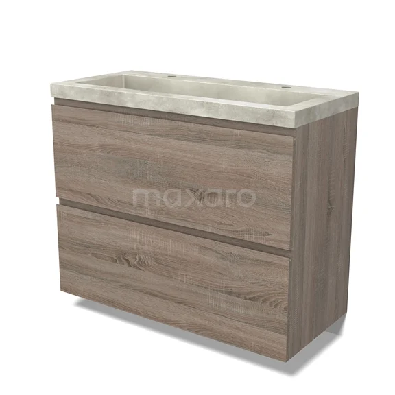 Modulo Waschtische | 100 cm Eiche Grifflos front Beton 2 hohe Schubladen übereinanderliegend