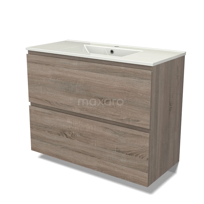 Modulo Waschtische | 100 cm Eiche Grifflos front Keramik 2 hohe Schubladen übereinanderliegend