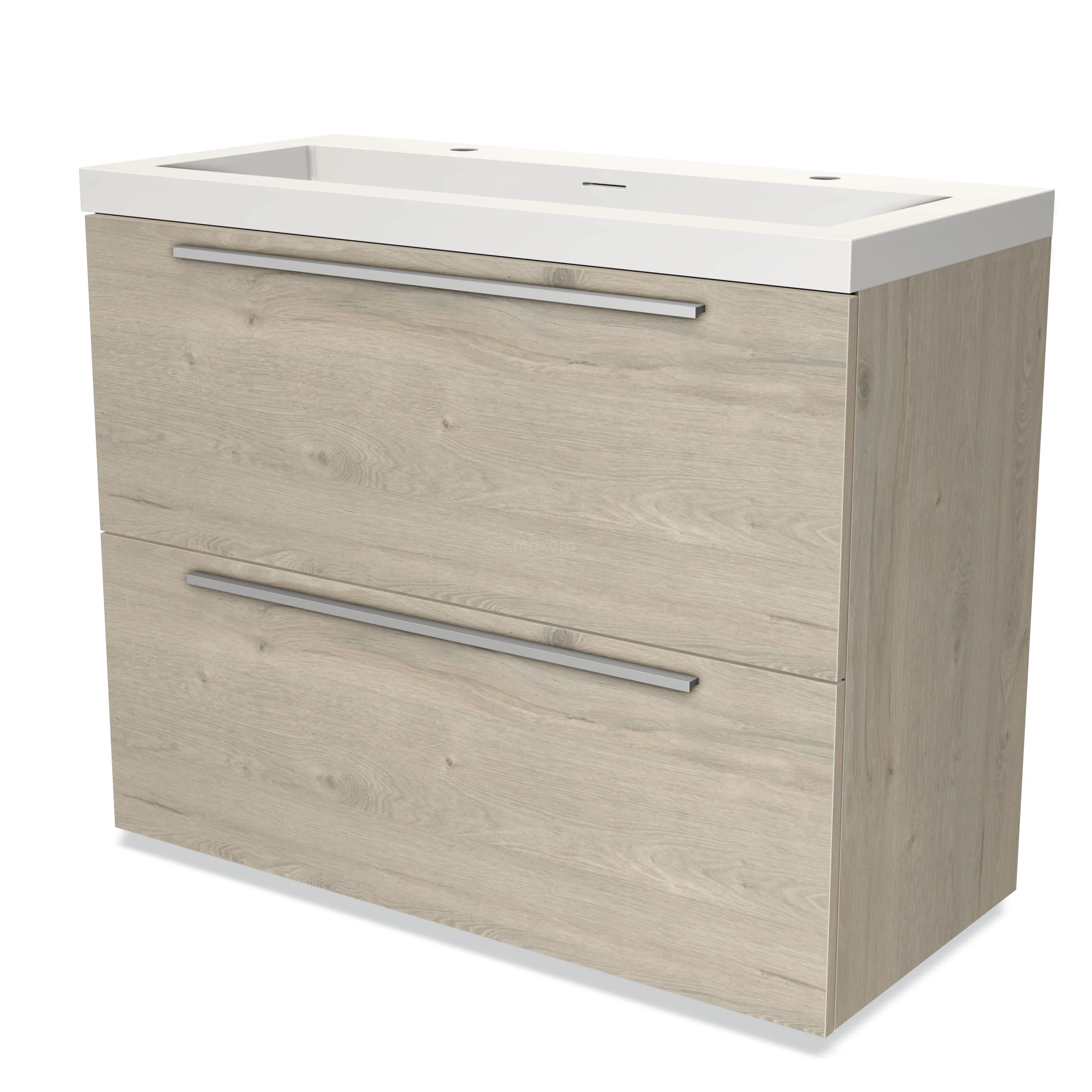 Modulo Waschtische | 100 cm Hellgraue Eiche Flach front Solid Surface 2 hohe Schubladen übereinanderliegend