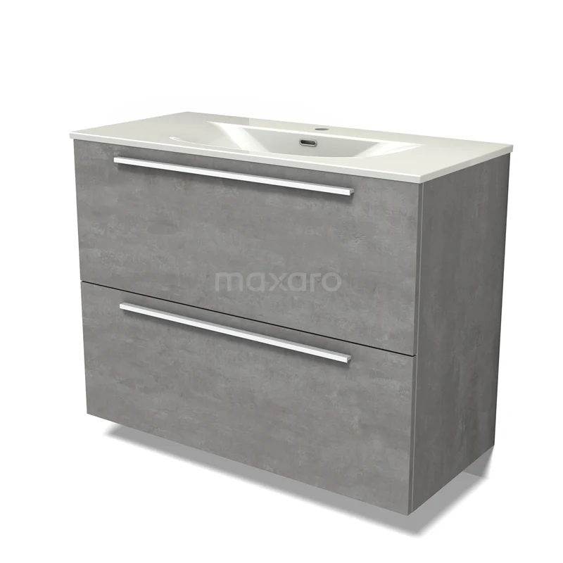 Modulo Waschtische | 100 cm Hellgrauer Beton Flach front Keramik 2 hohe Schubladen übereinanderliegend