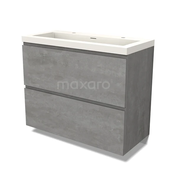 Modulo Waschtische | 100 cm Hellgrauer Beton Grifflos front Solid Surface 2 hohe Schubladen übereinanderliegend