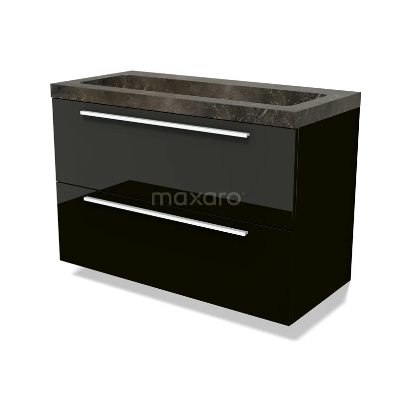 Modulo Waschtische | 100 cm Hochglanz Schwarz Flach front Naturstein 2 übereinanderliegende Schubladen