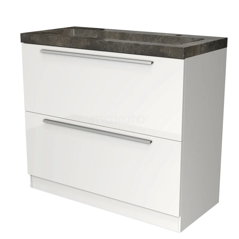 Modulo Waschtische | 100 cm Hochglanz Weiß Flach front Naturstein 2 hohe Schubladen übereinanderliegend
