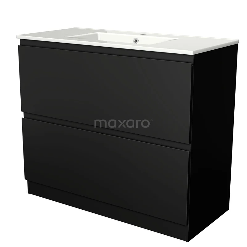Modulo Waschtische | 100 cm Matt Schwarz Grifflos front Keramik 2 hohe Schubladen übereinanderliegend