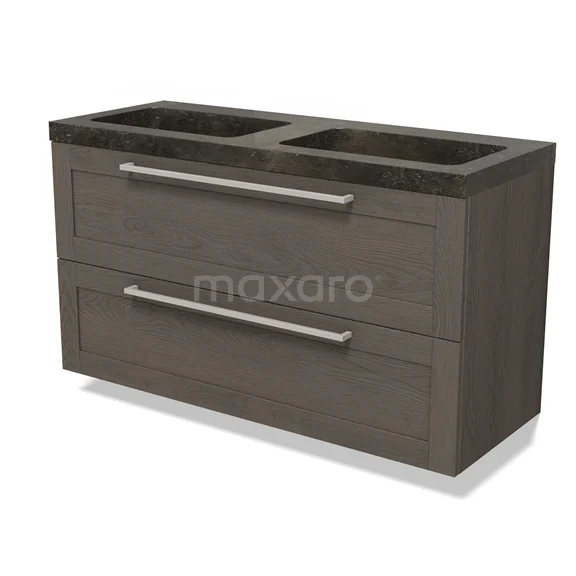 Modulo Waschtische | 120 cm Dunkelbraune Eiche Rahmen front Naturstein 2 übereinanderliegende Schubladen