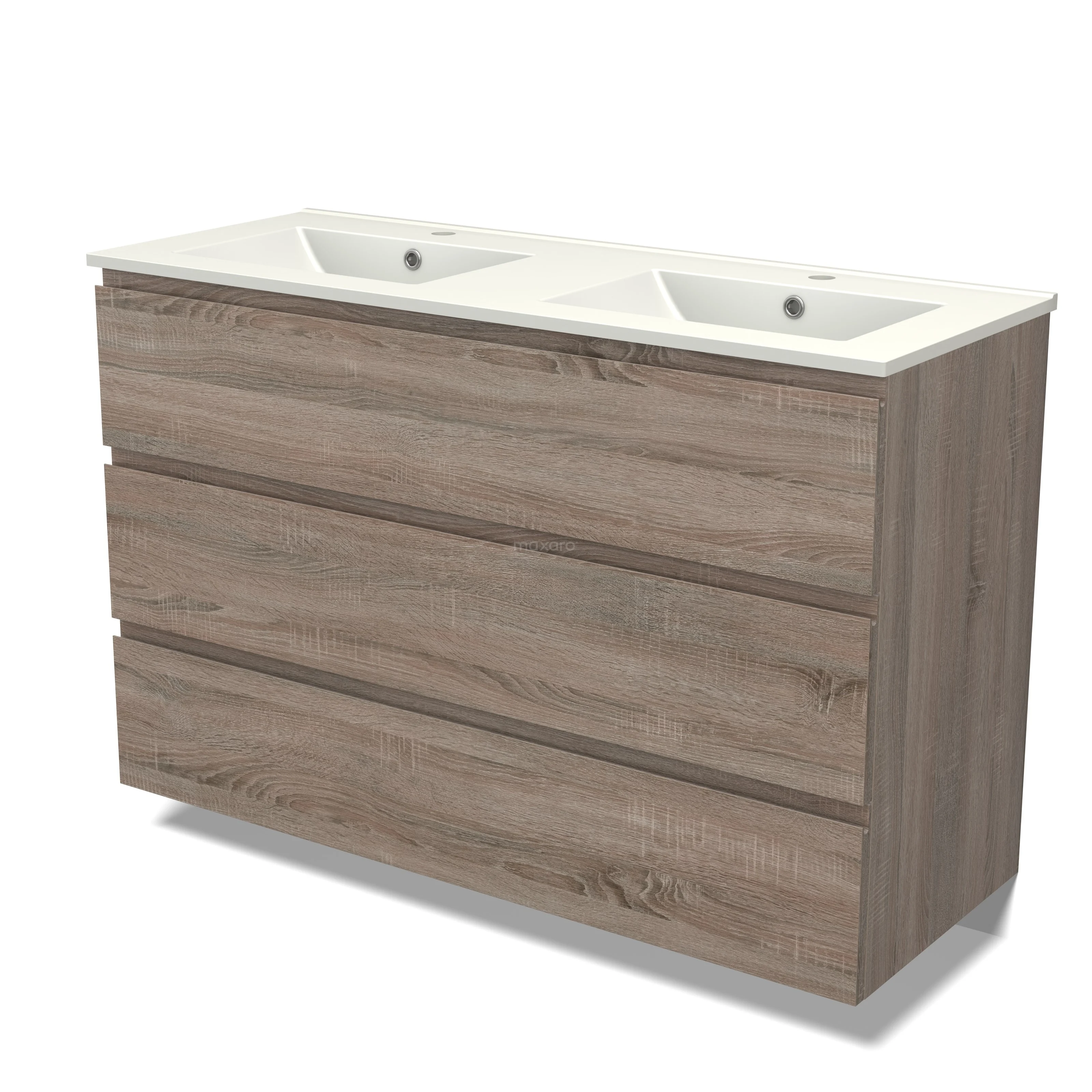 Das bodenstehende Badmöbel (121 cm) ist das Herzstück für die tägliche Körperpflege wie Schminken, Rasieren oder Zähneputzen. Das Waschbecken hat 2 Hahnlöcher und ist ideal für die gleichzeitige Nutzung durch mehrere Personen. Das Möbel bietet außerdem genügend Platz, um Ihre WC- und Pflegeprodukte ordentlich zu verstauen.