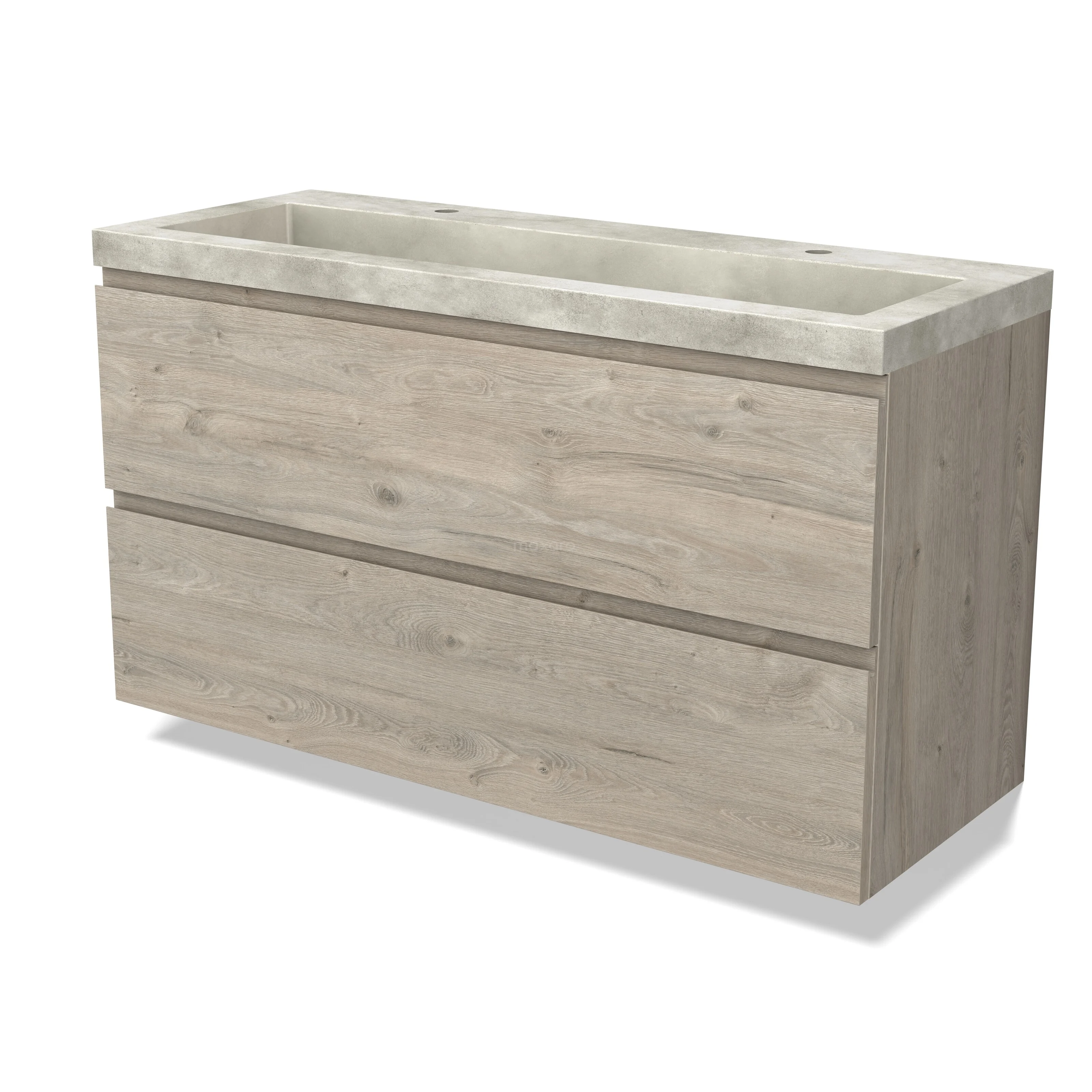 Modulo Waschtische | 120 cm Hellgraue Eiche Grifflos front Beton 2 übereinanderliegende Schubladen