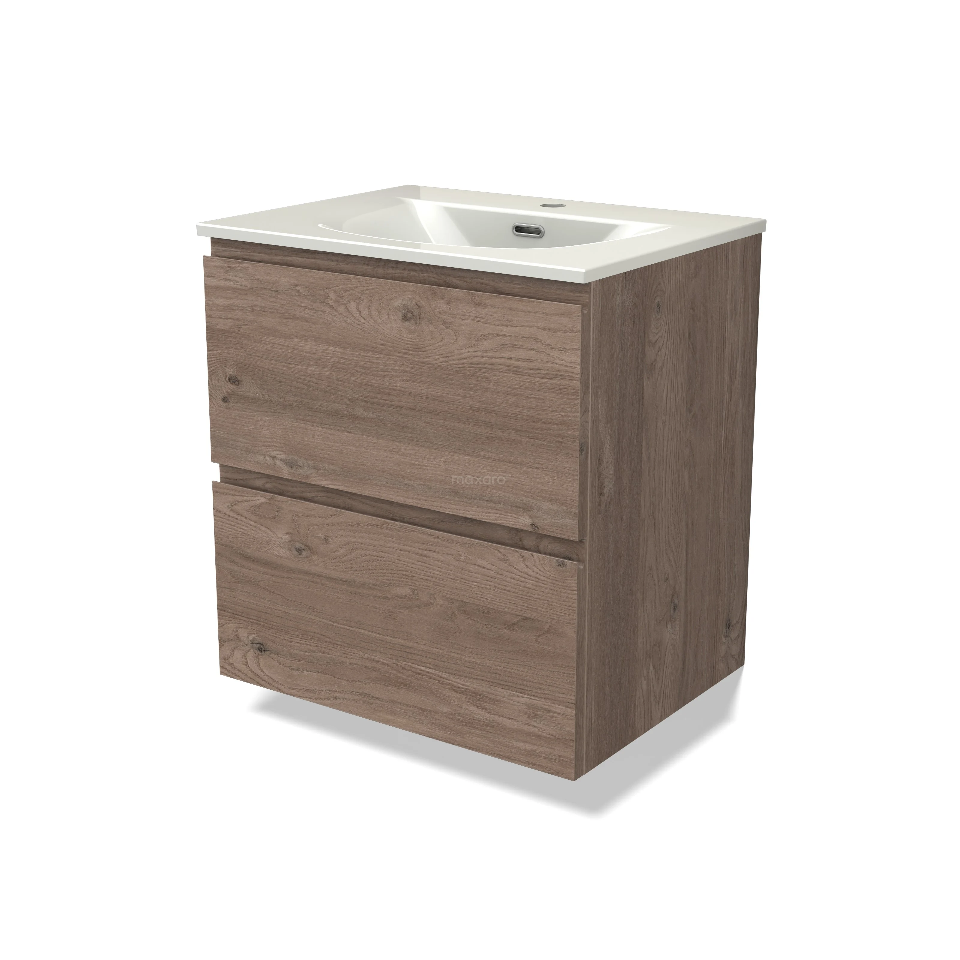 Modulo Waschtische | 60 cm Mittelbraune Eiche Grifflos front Keramik 2 übereinanderliegende Schubladen