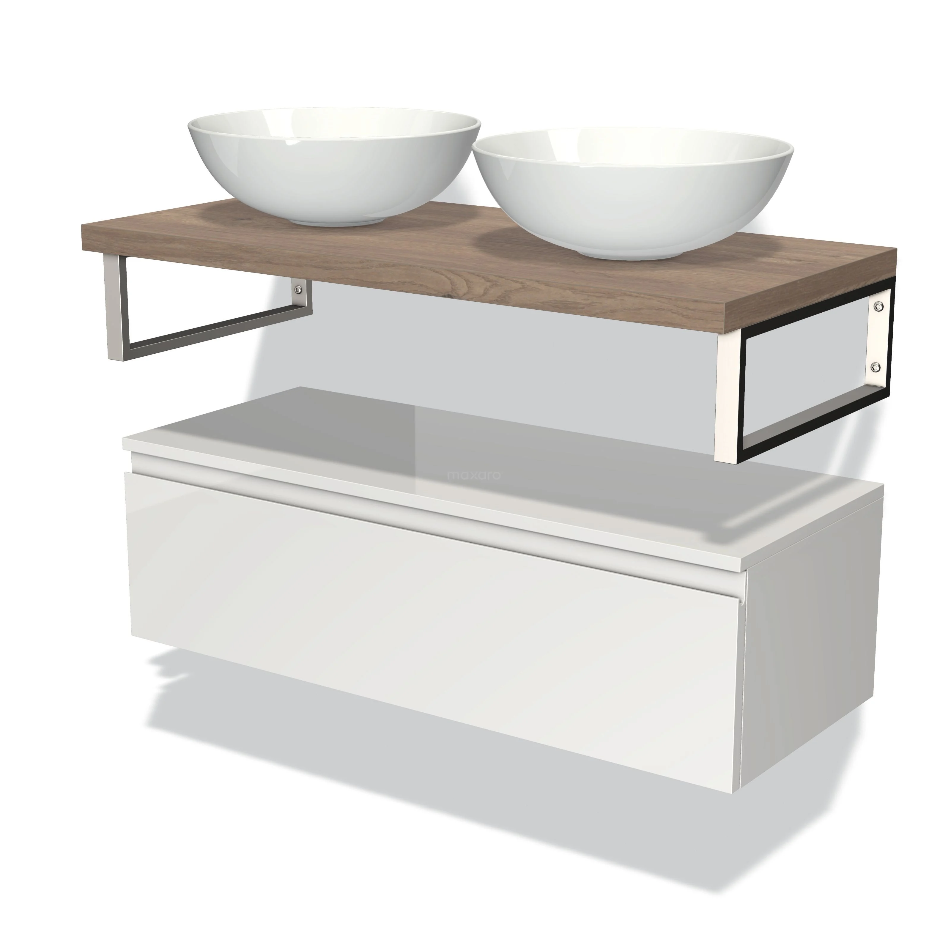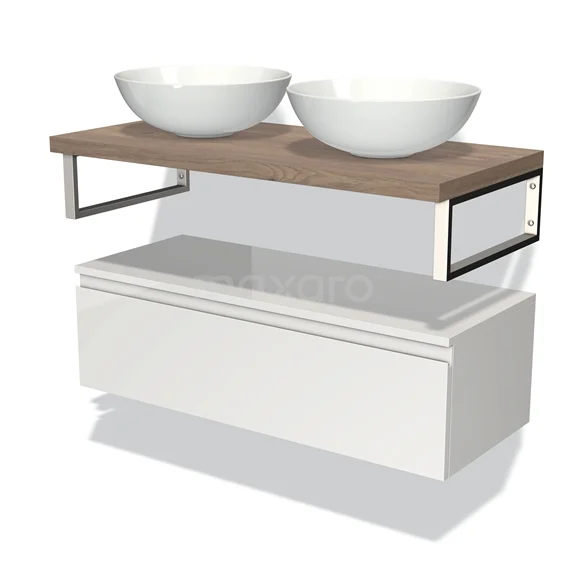 Modulo Plato Badmöbel mit Aufsatzwaschbecken | 100 cm Hochglanz Weiß Grifflos front Mittelbraune Eiche blatt Tief hängend