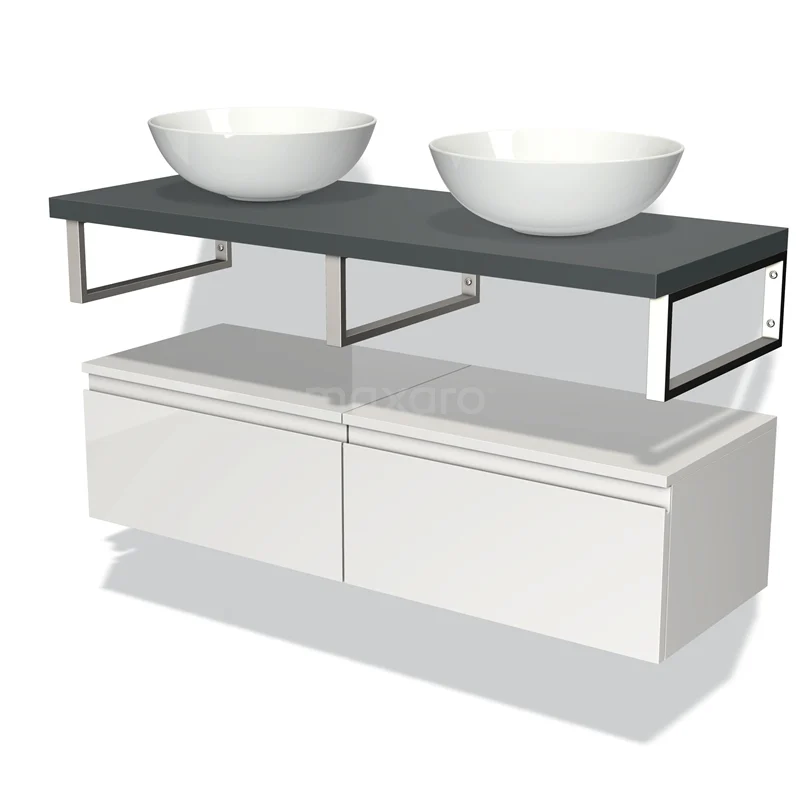 Badmöbel für Aufsatzwaschbecken 120 cm Modulo Plato Hochglanz Weiß 2 Schubladen Grifflos Dunkelgrau Platte