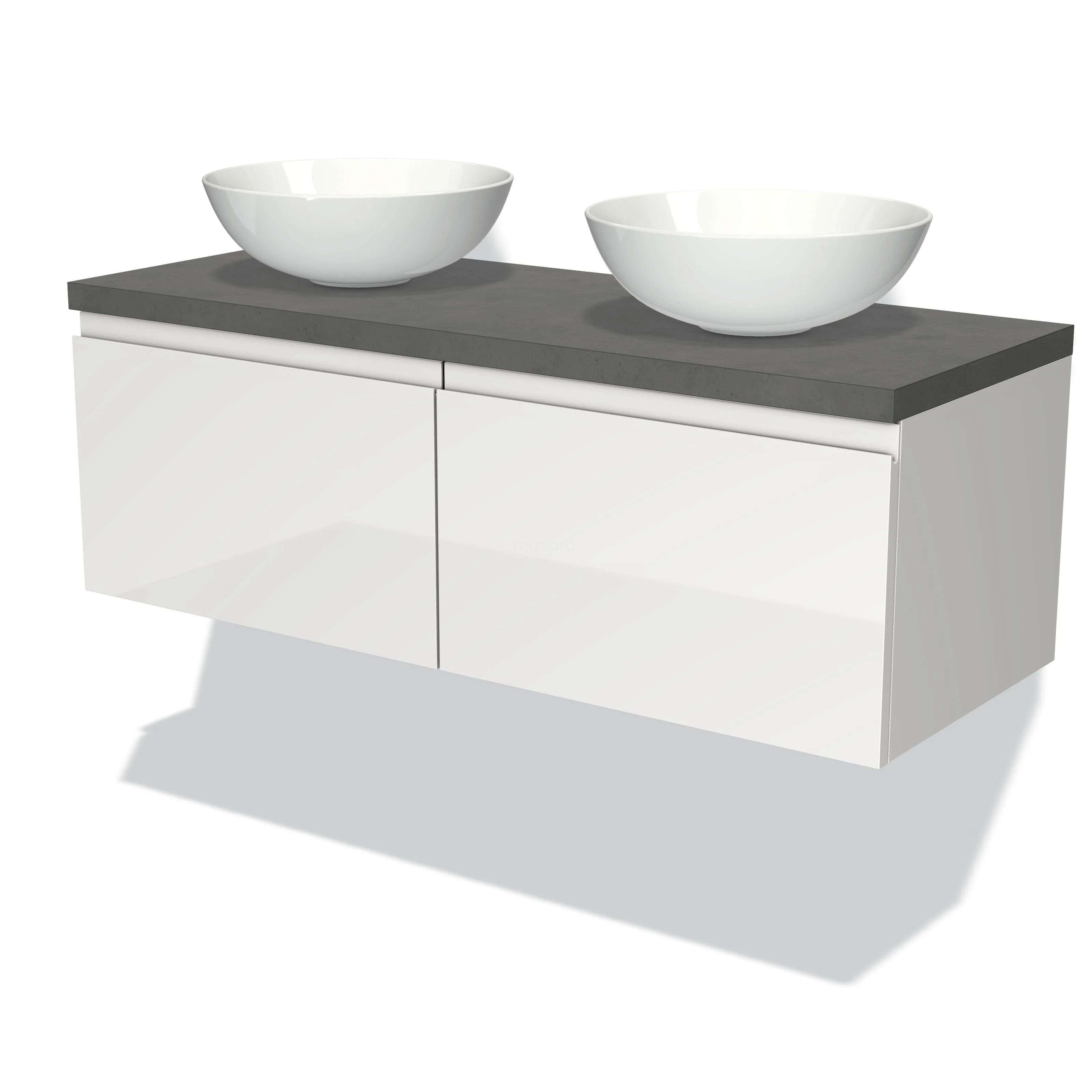 Badmöbel für Aufsatzwaschbecken 120cm Modulo Plato Hochglanz Weiß 2 Schubladen Grifflos Dunkelgrau Beton Platte