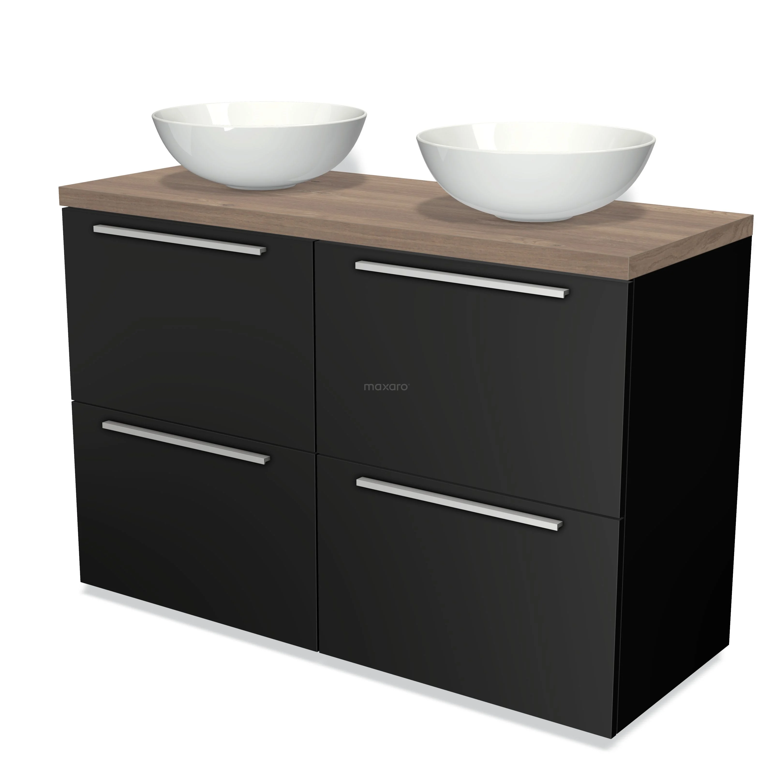 Modulo Plato Badmöbel mit Aufsatzwaschbecken | 120 cm Matt Schwarz Flach front Mittelbraune Eiche blatt 4 hohe Schubladen