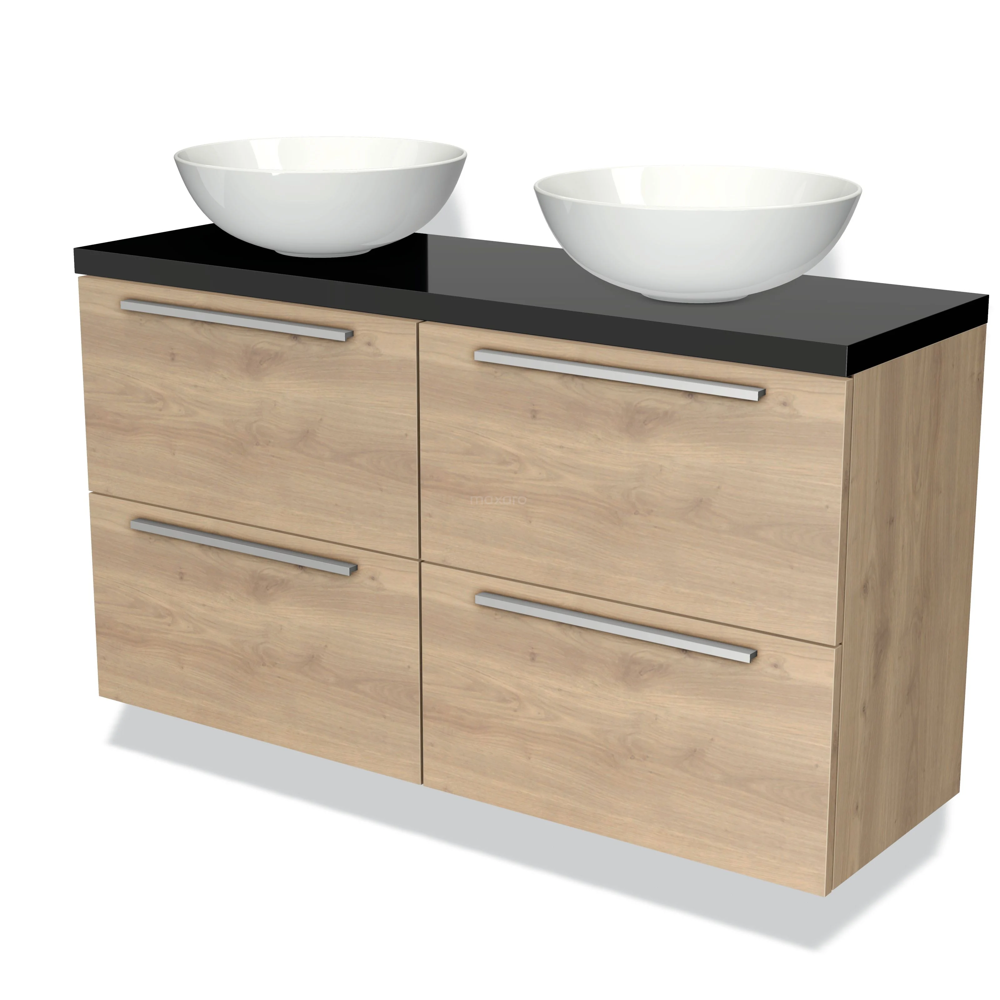 Badmöbel für Aufsatzwaschbecken 120cm Modulo Plato Slim Hellbraune Eiche 4 Schubladen Flach Hochglanz Schwarz Platte