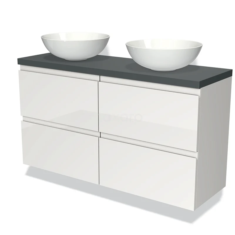 Badmöbel für Aufsatzwaschbecken 120cm Modulo Plato Slim Hochglanz Weiß 4 Schubladen grifflos Dunkelgrau Platte