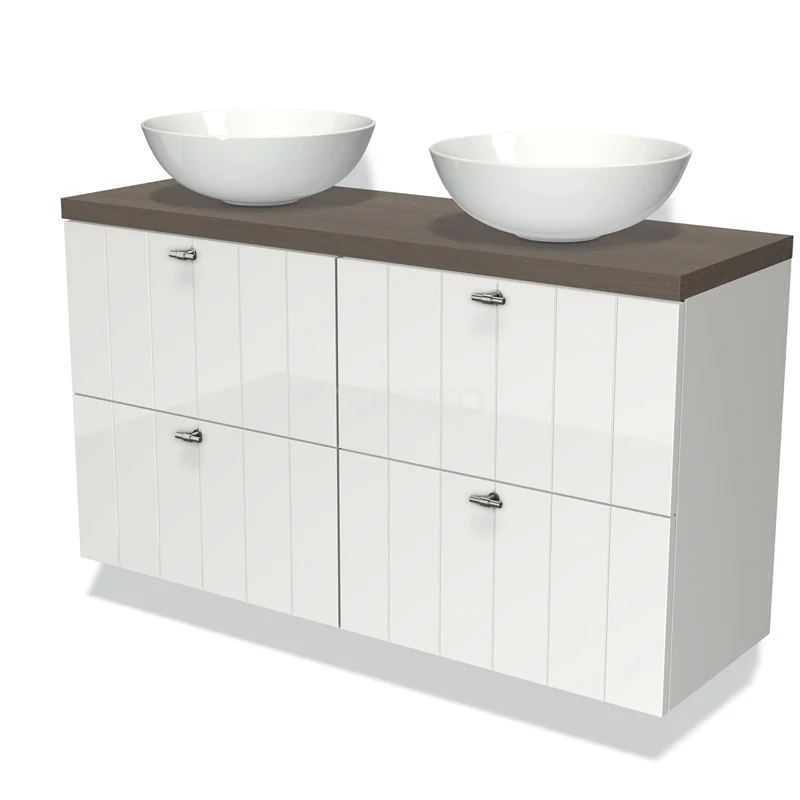 Badmöbel für Aufsatzwaschbecken 120cm Modulo Plato Slim Hochglanz Weiß 4 Schubladen Laminat dunkelbraune Eiche Platte