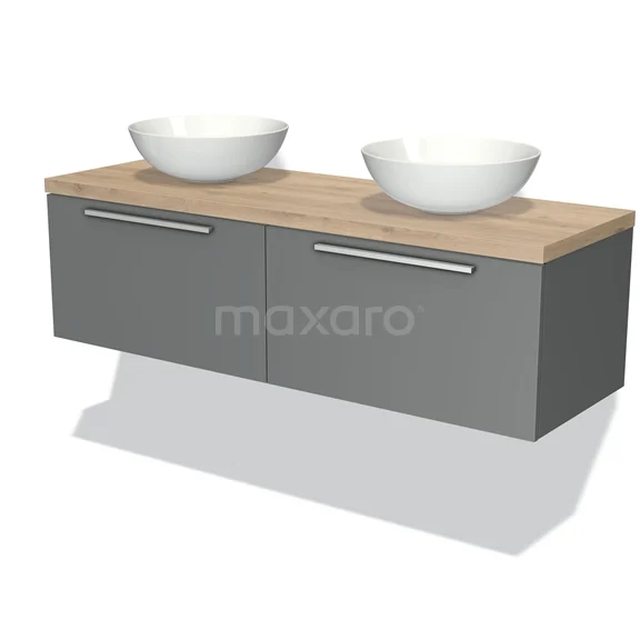 Badmöbel für Aufsatzwaschbecken 140cm Modulo Plato Mittelgrau 2 Schubladen Flach Hellbraune Eiche Platte