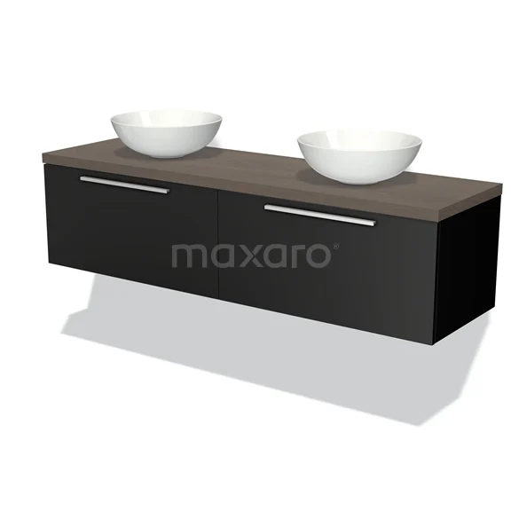 Badmöbel für Aufsatzwaschbecken 160cm Modulo Plato Matt Schwarz 2 Schubladen Flach dunkelbraune Eiche Platte